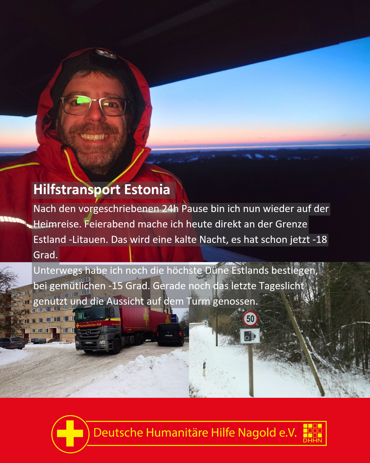 Nach den vorgeschriebenen 24h Pause bin ich nun wieder auf der Heimreise. Feierabend mache ich heute direkt an der Grenze Estland -Litauen. Das wird eine kalte Nacht, es hat schon jetzt -18 Grad.Unterwegs habe ich noch die höchste Düne Estlands…