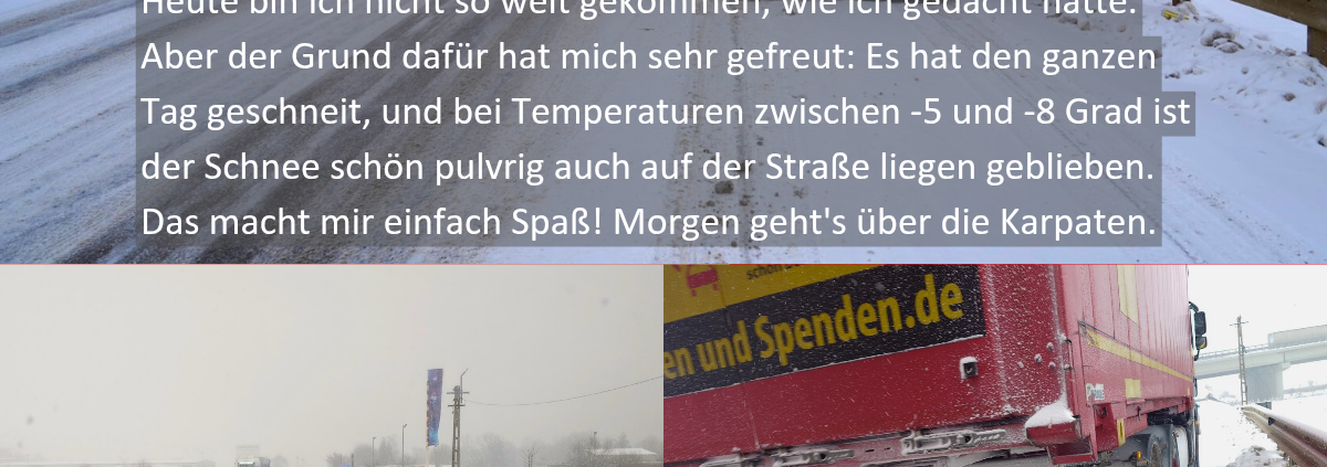 Heute bin ich nicht so weit gekommen, wie ich gedacht hatte. Aber der Grund dafür hat mich sehr gefreut: Es hat den ganzen Tag geschneit, und bei Temperaturen zwischen -5 und -8 Grad ist der Schnee schön pulvrig auch auf der Straße liegen geblieben. Das macht mir einfach Spaß! Morgen geht’s über die Karpaten.