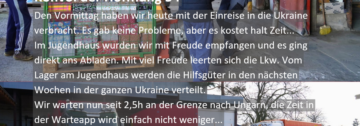 Den Vormittag haben wir heute mit der Einreise in die Ukraine verbracht. Es gab keine Probleme, aber es kostet halt Zeit…Im Jugendhaus wurden wir mit Freude empfangen und es ging direkt ans Abladen. Mit viel Freude leerten sich die Lkw. Vom Lager am Jugendhaus werden die Hilfsgüter in den nächsten Wochen in der ganzen Ukraine […]