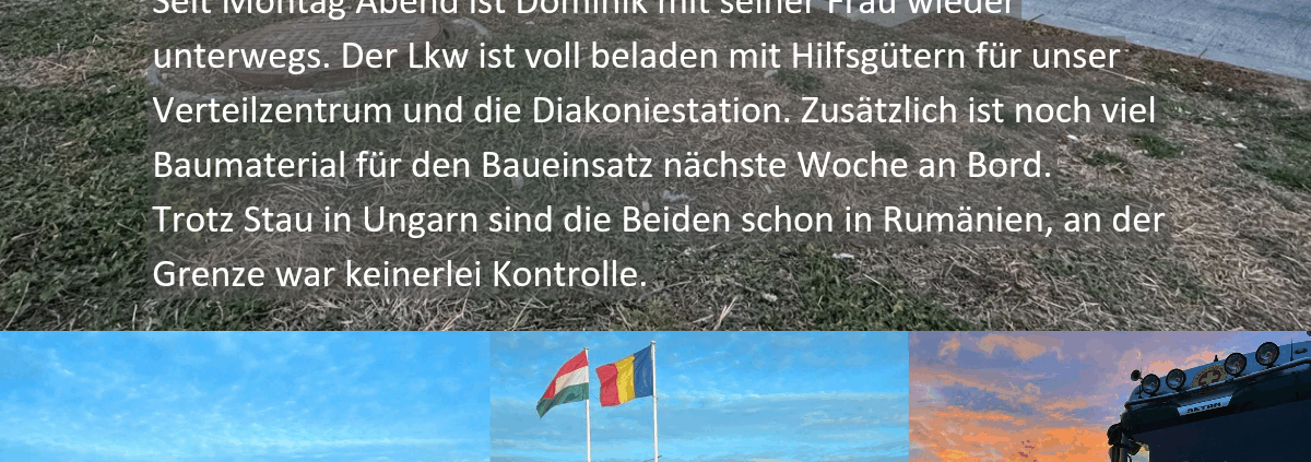 Seit Montag Abend ist Dominik mit seiner Frau wieder unterwegs. Der Lkw ist voll beladen mit Hilfsgütern für unser Verteilzentrum und die Diakoniestation. Zusätzlich ist noch viel Baumaterial für den Baueinsatz nächste Woche an Bord.Trotz Stau in Ungarn sind die Beiden schon in Rumänien, an der Grenze war keinerlei Kontrolle.