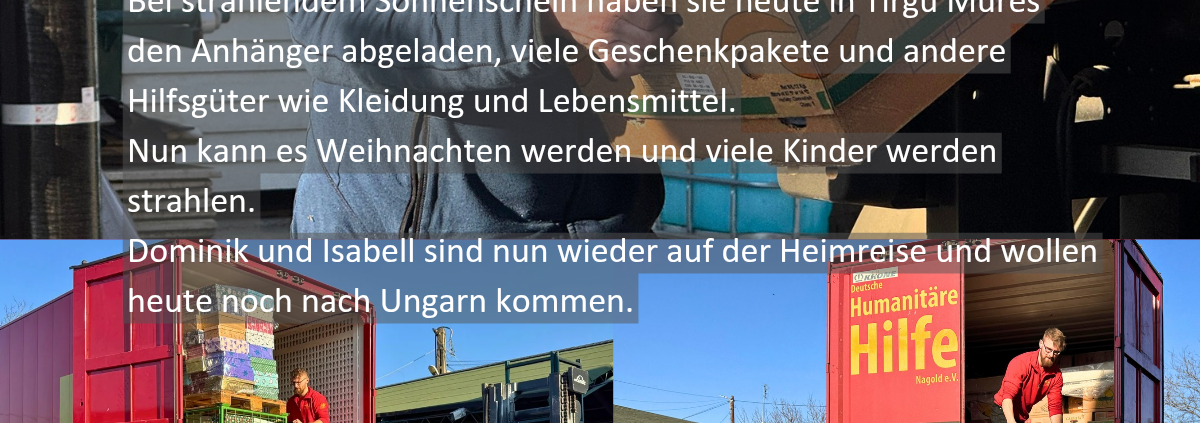 Bei strahlendem Sonnenschein haben sie heute in Tirgu Mures den Anhänger abgeladen, viele Geschenkpakete und andere Hilfsgüter wie Kleidung und Lebensmittel.Nun kann es Weihnachten werden und viele Kinder werden strahlen.Dominik und Isabell sind nun wieder auf der Heimreise und wollen heute noch nach Ungarn kommen.