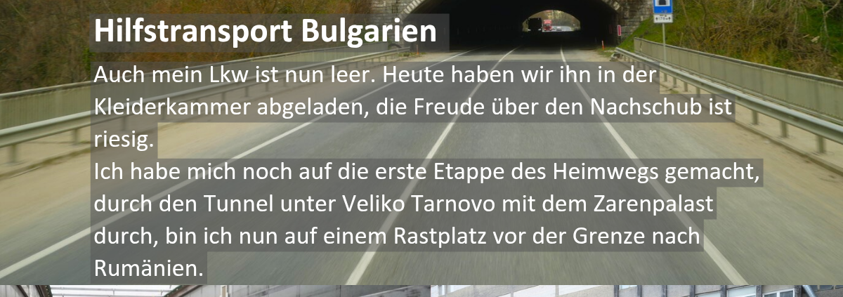 Auch mein Lkw ist nun leer. Heute haben wir ihn in der Kleiderkammer abgeladen, die Freude über den Nachschub ist riesig.Ich habe mich noch auf die erste Etappe des Heimwegs gemacht, durch den Tunnel unter Veliko Tarnovo mit dem Zarenpalast durch, bin ich nun auf einem Rastplatz vor der Grenze nach Rumänien.