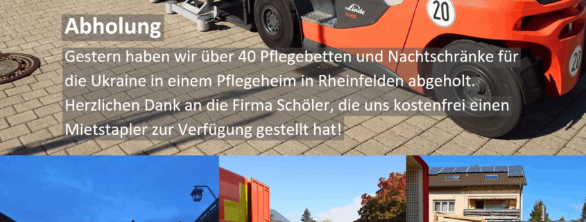 Gestern haben wir über 40 Pflegebetten und Nachtschränke für die Ukraine in einem Pflegeheim in Rheinfelden abgeholt. Herzlichen Dank an die Firma Schöler, die uns kostenfrei einen Mietstapler zur Verfügung gestellt hat!