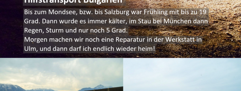 Bis zum Mondsee, bzw. bis Salzburg war Frühling mit bis zu 19 Grad. Dann wurde es immer kälter, im Stau bei München dann Regen, Sturm und nur noch 5 Grad. Morgen machen wir noch eine Reparatur in der Werkstatt in Ulm, und dann darf ich endlich wieder heim!