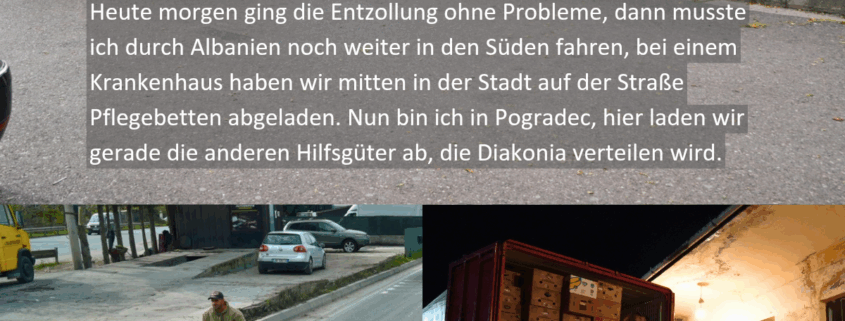 Heute morgen ging die Entzollung ohne Probleme, dann musste ich durch Albanien noch weiter in den Süden fahren, bei einem Krankenhaus haben wir mitten in der Stadt auf der Straße Pflegebetten abgeladen. Nun bin ich in Pogradec, hier laden wir gerade die anderen Hilfsgüter ab, die Diakonia verteilen wird.
