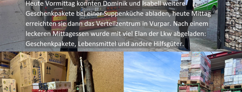 Heute Vormittag konnten Dominik und Isabell weitere Geschenkpakete bei einer Suppenküche abladen, heute Mittag erreichten sie dann das Verteilzentrum in Vurpar. Nach einem leckeren Mittagessen wurde mit viel Elan der Lkw abgeladen: Geschenkpakete, Lebensmittel und andere Hilfsgüter.