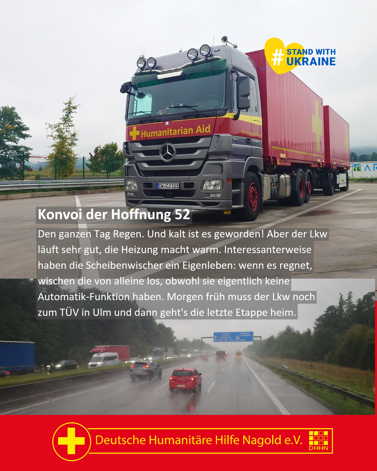Den ganzen Tag Regen. Und kalt ist es geworden! Aber der Lkw läuft sehr gut, die Heizung macht warm. Interessanterweise haben die Scheibenwischer ein Eigenleben: wenn es regnet, wischen die von alleine los, obwohl sie eigentlich keine Automatik-Funktion haben. Morgen früh muss der Lkw noch zum TÜV in Ulm und dann geht’s die letzte Etappe heim.