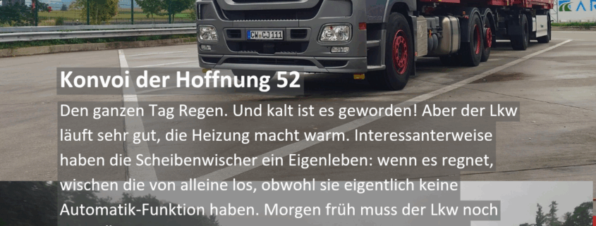 Den ganzen Tag Regen. Und kalt ist es geworden! Aber der Lkw läuft sehr gut, die Heizung macht warm. Interessanterweise haben die Scheibenwischer ein Eigenleben: wenn es regnet, wischen die von alleine los, obwohl sie eigentlich keine Automatik-Funktion haben. Morgen früh muss der Lkw noch zum TÜV in Ulm und dann geht’s die letzte Etappe heim.