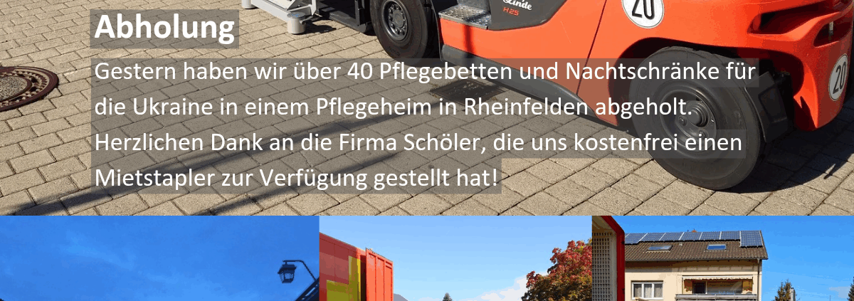 Gestern haben wir über 40 Pflegebetten und Nachtschränke für die Ukraine in einem Pflegeheim in Rheinfelden abgeholt. Herzlichen Dank an die Firma Schöler, die uns kostenfrei einen Mietstapler zur Verfügung gestellt hat!