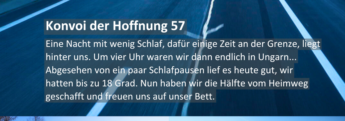 Eine Nacht mit wenig Schlaf, dafür einige Zeit an der Grenze, liegt hinter uns. Um vier Uhr waren wir dann endlich in Ungarn…Abgesehen von ein paar Schlafpausen lief es heute gut, wir hatten bis zu 18 Grad. Nun haben wir die Hälfte vom Heimweg geschafft und freuen uns auf unser Bett.