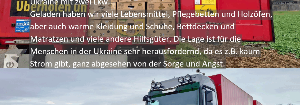Morgen früh starten wir den nächsten Hilfstransport in die Ukraine mit zwei Lkw.Geladen haben wir viele Lebensmittel, Pflegebetten und Holzöfen, aber auch warme Kleidung und Schuhe, Bettdecken und Matratzen und viele andere Hilfsgüter. Die Lage ist für die Menschen in der Ukraine sehr herausfordernd, da es z.B. kaum Strom gibt, ganz abgesehen von der Sorge […]
