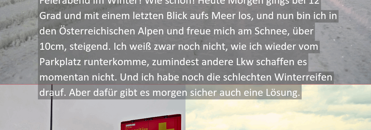 Feierabend im Winter! Wie schön! Heute Morgen gings bei 12 Grad und mit einem letzten Blick aufs Meer los, und nun bin ich in den Österreichischen Alpen und freue mich am Schnee, über 10cm, steigend. Ich weiß zwar noch nicht, wie ich wieder vom Parkplatz runterkomme, zumindest andere Lkw schaffen es momentan nicht. Und ich […]