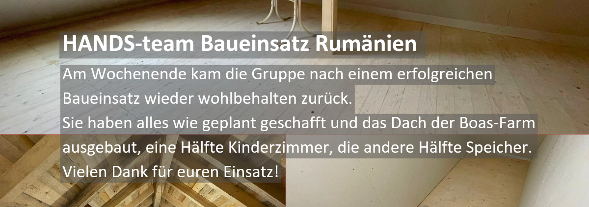 Am Wochenende kam die Gruppe nach einem erfolgreichen Baueinsatz wieder wohlbehalten zurück.Sie haben alles wie geplant geschafft und das Dach der Boas-Farm ausgebaut, eine Hälfte Kinderzimmer, die andere Hälfte Speicher.Vielen Dank für euren Einsatz!