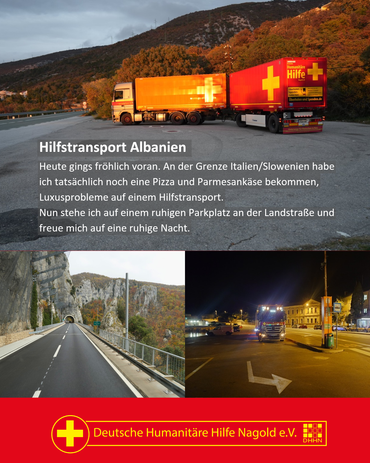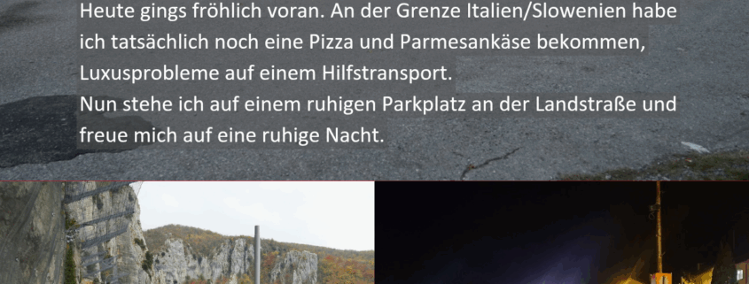 Heute gings fröhlich voran. An der Grenze Italien/Slowenien habe ich tatsächlich noch eine Pizza und Parmesankäse bekommen, Luxusprobleme auf einem Hilfstransport.