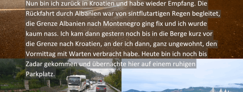 Nun bin ich zurück in Kroatien und habe wieder Empfang. Die Rückfahrt durch Albanien war von sintflutartigen Regen begleitet, die Grenze Albanien nach Montenegro ging fix und ich wurde kaum nass. Ich kam dann gestern noch bis in die Berge kurz vor die Grenze nach Kroatien, an der ich dann, ganz ungewohnt, den Vormittag mit Warten verbracht habe. Heute bin ich noch bis Zadar gekommen und übernachte hier auf einem ruhigen Parkplatz.