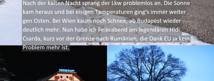 Nach der kalten Nacht sprang der Lkw problemlos an. Die Sonne kam heraus und bei eisigen Temperaturen ging’s immer weiter gen Osten. Bei Wien kaum noch Schnee, ab Budapest wieder deutlich mehr. Nun habe ich Feierabend am legendären Hidi Csarda, kurz vor der Grenze nach Rumänien, die Dank EU ja kein Problem mehr ist.