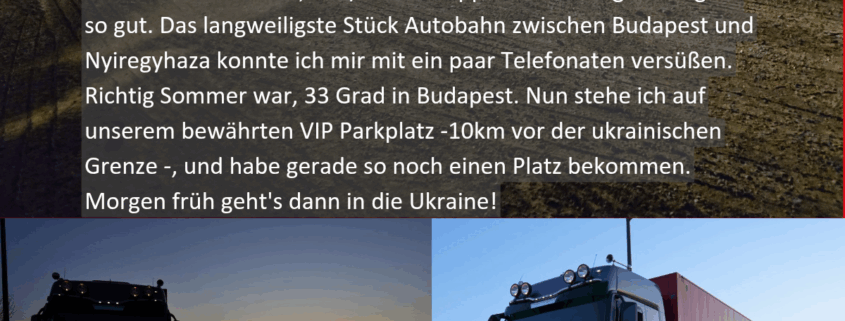 Richtig Sommer war, 33 Grad in Budapest. Nun stehe ich auf unserem bewährten VIP Parkplatz -10km vor der ukrainischen Grenze -, und habe gerade so noch einen Platz bekommen.