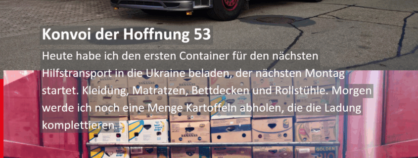 Heute habe ich den ersten Container für den nächsten Hilfstransport in die Ukraine beladen, der nächsten Montag startet. Kleidung, Matratzen, Bettdecken und Rollstühle. Morgen werde ich noch eine Menge Kartoffeln abholen, die die Ladung komplettieren.
